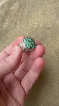 This Majorca ring features a chunk of polished Turquoise with blue-green granules floating in a sable matrix. This eye catching stone is set in a Fine Silver bezel. The wide Sterling Silver band is hand stamped in my Atoll pattern. Ring is US size 8.