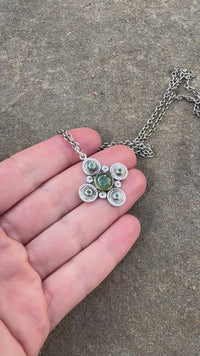 The Margarita necklace is composed of a lovely blue green Tourmaline cabochon set in an 18k Gold bezel and surrounded by a pattern of Silver disks and faceted mini Emeralds. This lovely pendant is both striking and low key, perfect for every day, layering and on it's own.