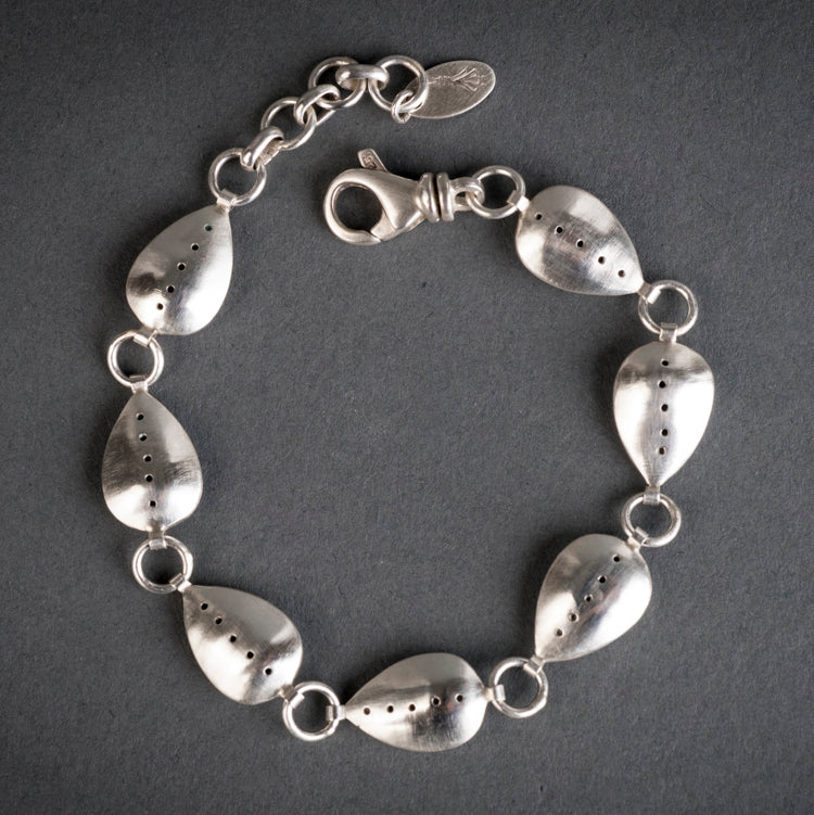 The Acacia bracelet is made up of little hollow form Silver pods that I made from scratch. I am a little obsessed with hollow forms and the way they feel in your fingers, delicately domed on both side. The little almond shaped pods are made from Sterling Silver that is tarnish resistant. I have accented the hollow forms with tiny drilled holes for a lacy finish. This lovely bracelet is perfect on its own or layered.