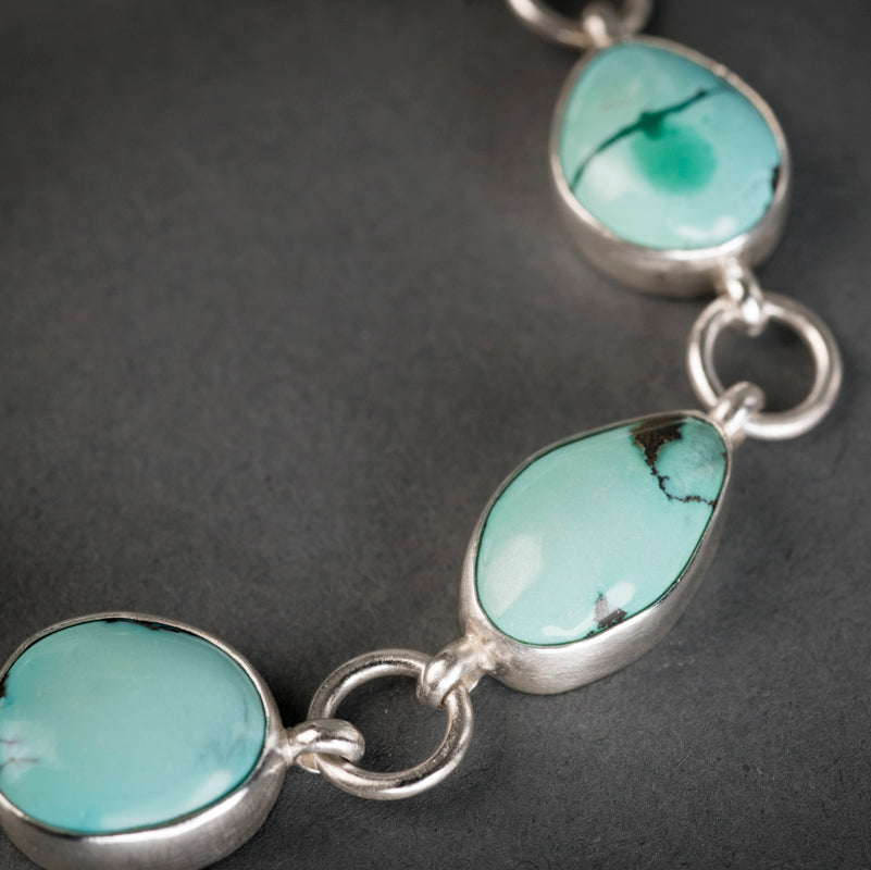 The Luna bracelet features nuggets of Hubei Turquoise set in bezels of Fine Silver. The simple bezels are accented with 1/2 round bales and large heavy ring for an elegant finish.