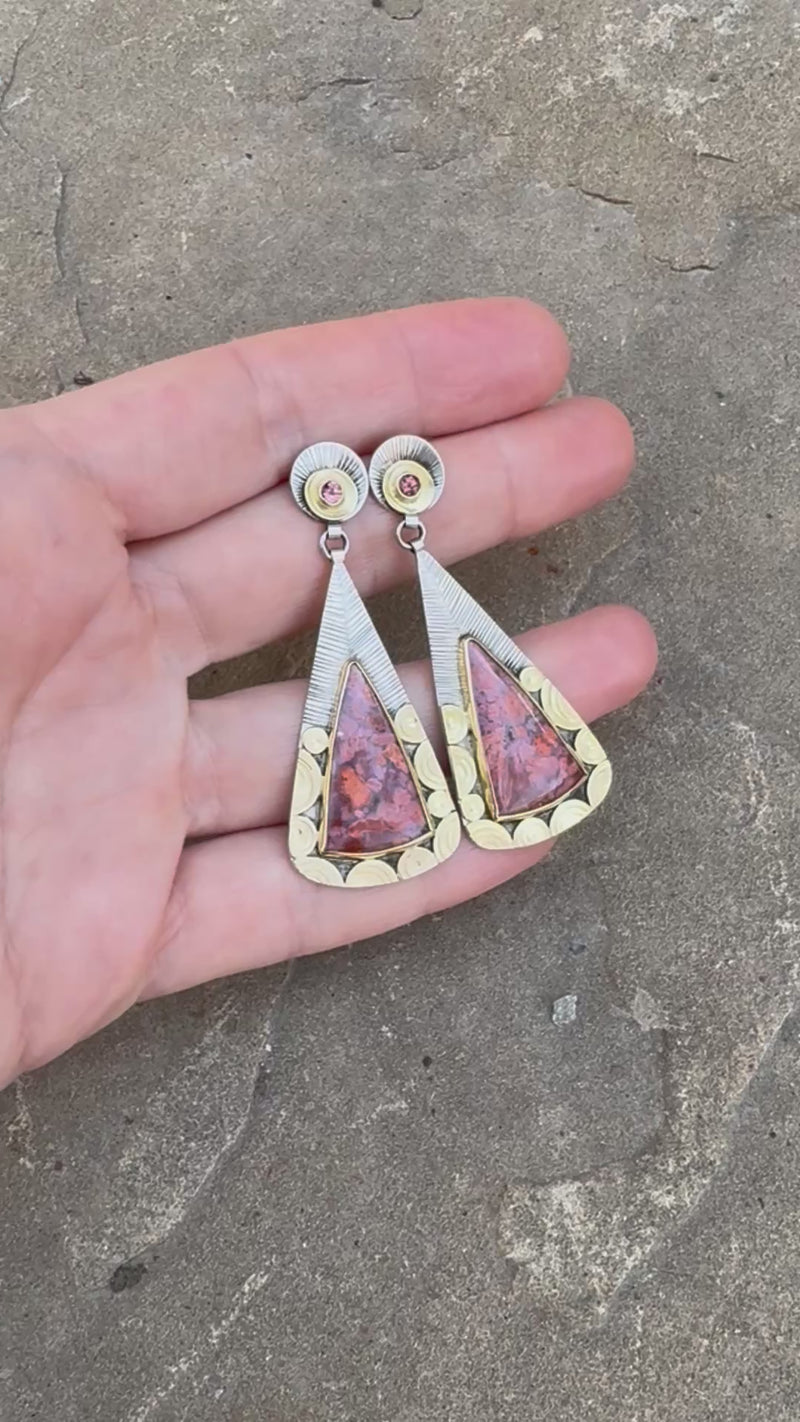 These Elba earrings have the perfect combination of industrial and luxury... one of my favorite motifs. Rare Confetti Agate, cut by accomplished lapidary Greg King, have stunning color and texture. These eye catching stones are set in 18k Gold bezels and surrounded by a combo of my Gold disks and hand stamped fishtail design on Silver. The elaborate dangles hang from equally detailed studs adorned with faceted Pink Garnet set in 18k Gold on Silver. The backs have been cut out behind the Agates to keep these earrings relatively light.