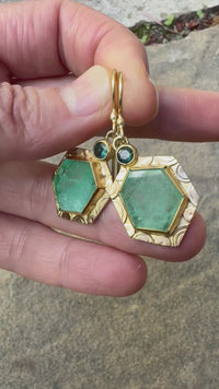 The Madeira earrings feature stunning natural Emerald Tablets in my favorite shade of green! These spectacular Emeralds are 11.28cts and truly glorious. These lovely stones are paired with lovely faceted Indicolite Tourmalines in such a beguiling color. These gorgeous stones are set in bezels of 22k Gold and surrounded by my patchwork disk motif, all in 18k Gold.