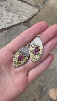 The Antigua Earrings feature gorgeous rose cut pink Tourmaline gemstones set in 18k Gold and enveloped in a cloud of 18k Gold disks with hand stamped "sun's rays" bursting over the top. The back plate of Sterling Silver has been oxidized to accentuate the details of these lovely earrings.