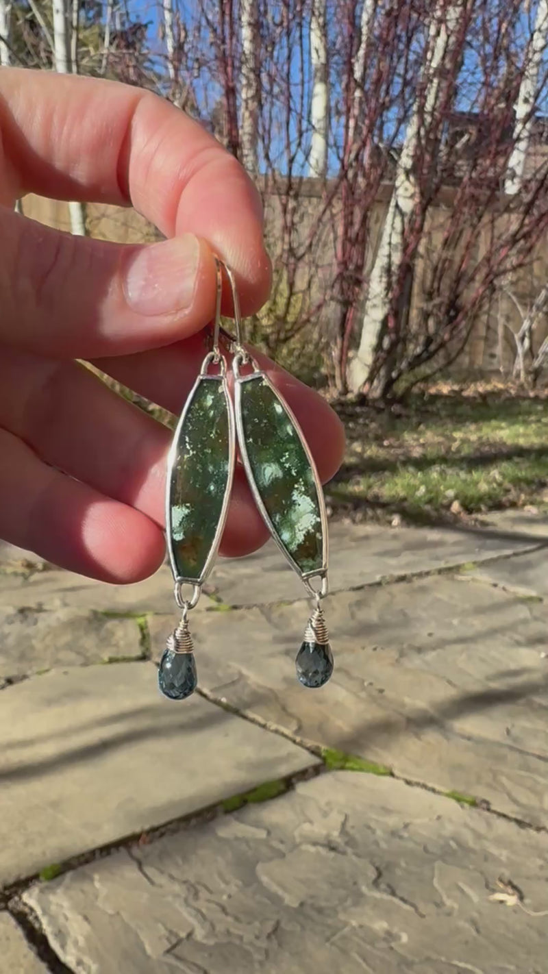 The Eos earrings feature rare Madagascar Ocean Jasper cabs in a deep green with bits of root beer coloring. These mysterious stones are set in bezels of brushed Fine Silver which are the perfect compliment. I have cut out the backs of the settings to let light shine through these translucent stones. I paired the moody stones with some equally moody London Blue Topaz briolettes that are the perfect pairing.