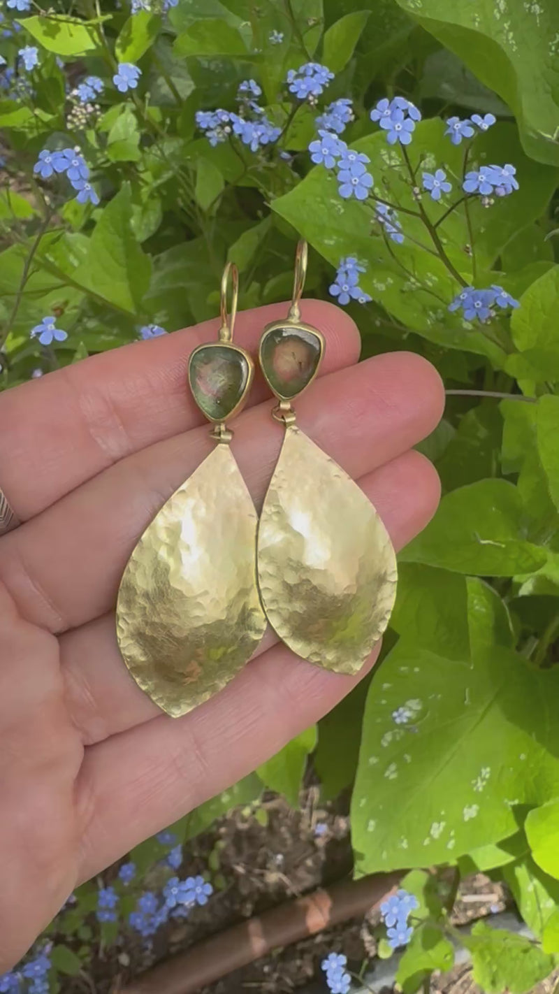 The Quinn earrings are a special design that is about texture as well as highlighting the lovely gemstones. These earrings feature some lovely Watermelon Tourmalines that aren't your typical high quality stones. These unusual stones have a core of pale peach surrounded by a band of bright pink and then a mossy green in deep cabochons. I think these stones are so gorgeous in an understated way that I thought they would best be paired with 18k brushed Gold that is also understated luxury. They are backed in Silver which reflects the true colors of the gemstones. The hammered leaf dangles are made of 18k Bimetal* and have a brushed finish.