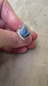 This Milan ring features a beautiful Australian Boulder Opal set in an 18k Gold bezel and accented with a rose cut Diamond, also set in 18k Gold. These lovely stones sit on a hand stamped Silver back that has been given a radial design. Simple and stunning! Ring is US size 8.