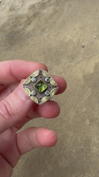 The Catalonia ring is an Art Deco inspired ring with a gorgeous olive green Tourmaline pyramid bezel set in an 18k Gold bezel. It is accented by little blue green Sapphires and hand stamped 18k Gold disks. A unique and unusual ring. Ring is US size 6 1/2.