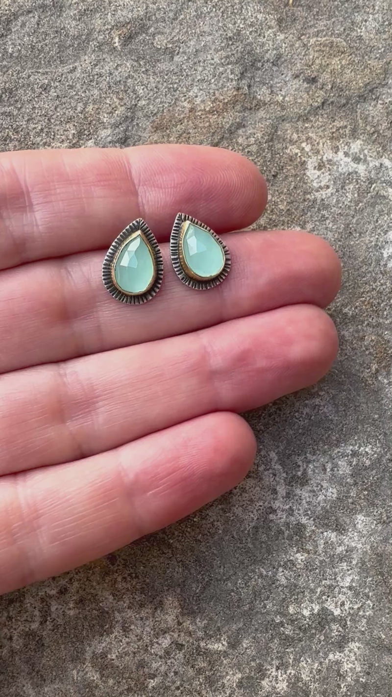 These beautiful little Sorento studs are perfect for everyday wear. They feature faceted aqua blue Chalcedony teardrops set in 18k Gold bezels and surrounded by a hand stamped Silver border.