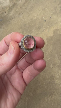 This Sorento ring features a lovely faceted Strawberry Quartz with bright coloring of tiny speckles suspended in a clear stone. This shimming stone is set in an 18k Gold bezel on a hand stamped Silver plate and band. Wear this beauty in it's own or add it to your favorite ring stack. Ring is US size 7.